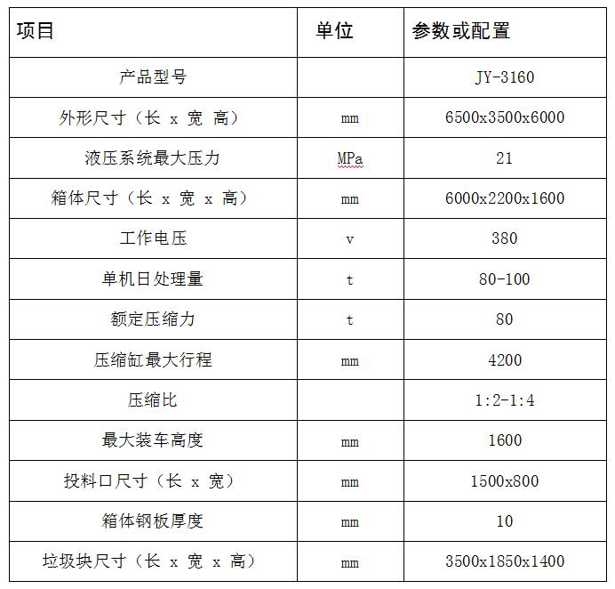 JY-3160 水平式四柱舉升垃圾壓縮設(shè)備主要用于對城鎮(zhèn)內(nèi)小區(qū)、居民點(diǎn)、學(xué)校、醫(yī)院、公園景區(qū)、廠礦和機(jī)關(guān)院校的生活垃圾以及固體廢棄物的收集、壓縮減容和封閉轉(zhuǎn)運(yùn)。