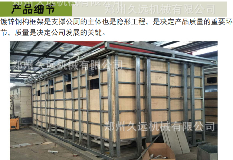 1、房體結(jié)構(gòu): 采用輕鋼龍骨結(jié)構(gòu),鋼材全部使用國(guó)家標(biāo)準(zhǔn)鍍鋅鋼材。根據(jù)房體的大小特選用國(guó)標(biāo)方管(50-100)焊接而成。鍍鋅管厚度為2.8mm,方管經(jīng)過(guò)除銹后進(jìn)行鍍鋅、防腐處理。這樣就會(huì)延長(zhǎng)廁所使用壽命。